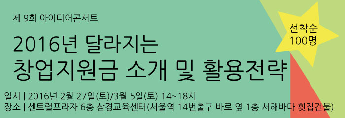 [선착순 100명] 제9회 아이디어콘서트 "2016년 정부지원 창업지원금 소개 및 활용전략" 행사 안내(2월 27일,3월 5일)