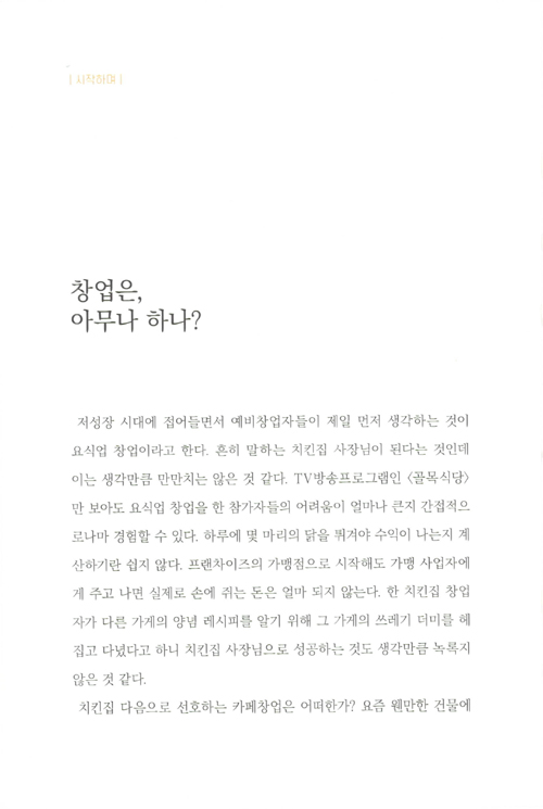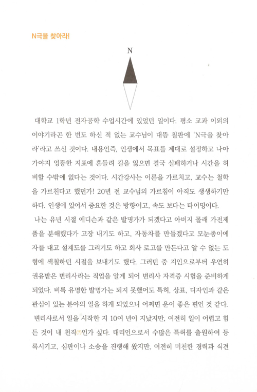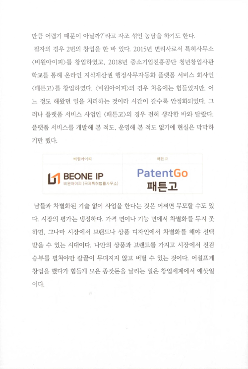 변리사로서 수많은 창업자를 만나 보았지만 허황된 한탕주의에 빠지거나 지나친 자기 확신에 빠진 창업자들이 성공한 사례는 아직 본 적이 없다. 늘 겸손하고 주위의 조언을 귀담아들을 줄 알면서 묵묵히 자기의 길을 가는 창업자들은 늦더라도 빛을 보기 마련이다. - p 22