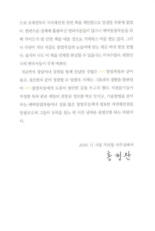 변리사에서 기술창업가로 새로운 도전 중인 홍정완 변리사의 기술창업에 도전하는 예비창업자들을 위한 지식재산권 가이드. 실제 청년창업사관학교 8기 졸업생인 홍정완 변리사는 2018년 기술