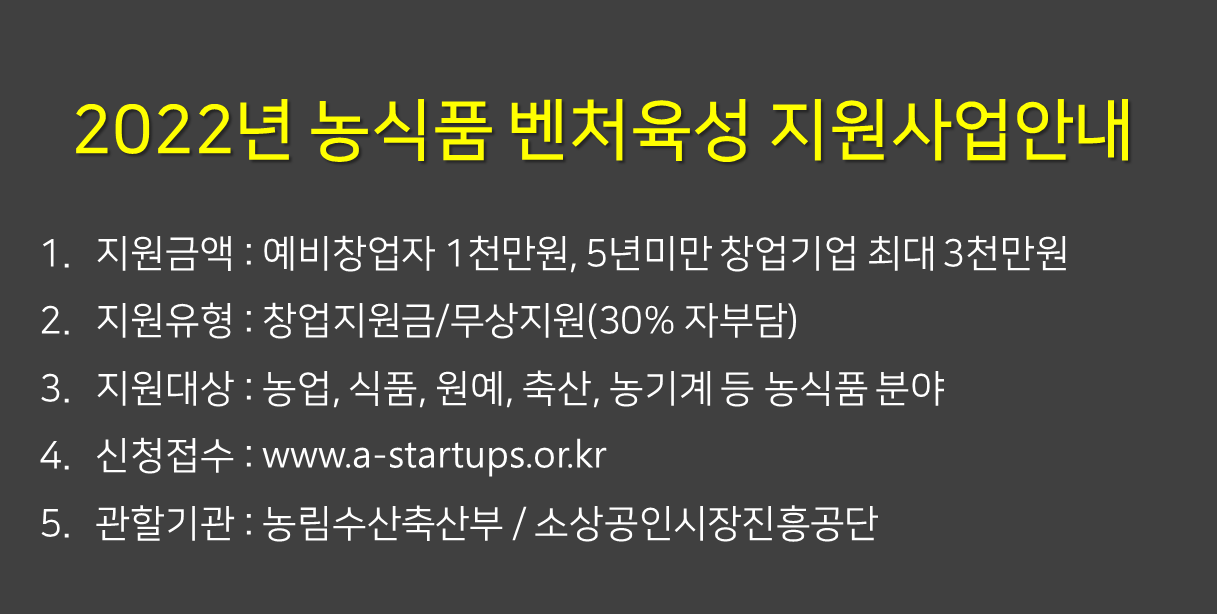 2022년 농식품 벤처육성 지원사업(창업기업) 모집 공고(~02/09)