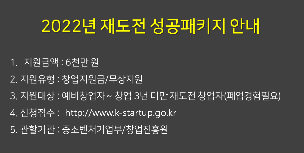예비재창업자 또는 재창업한 지 3년 이내 재창업기업에게 최대 6천만원을 지원하는 2022년 재도전 성공패키지 사업을 안내드립니다.