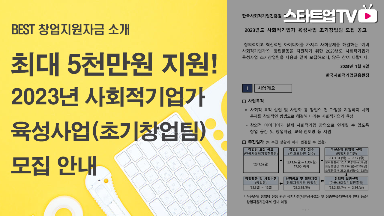 최대 5천만원을 지원하는 2023년 사회적기업가육성사업 초기창업팀 모집안내(예비창업팀 지원가능, 1월 30일 마감) 본문