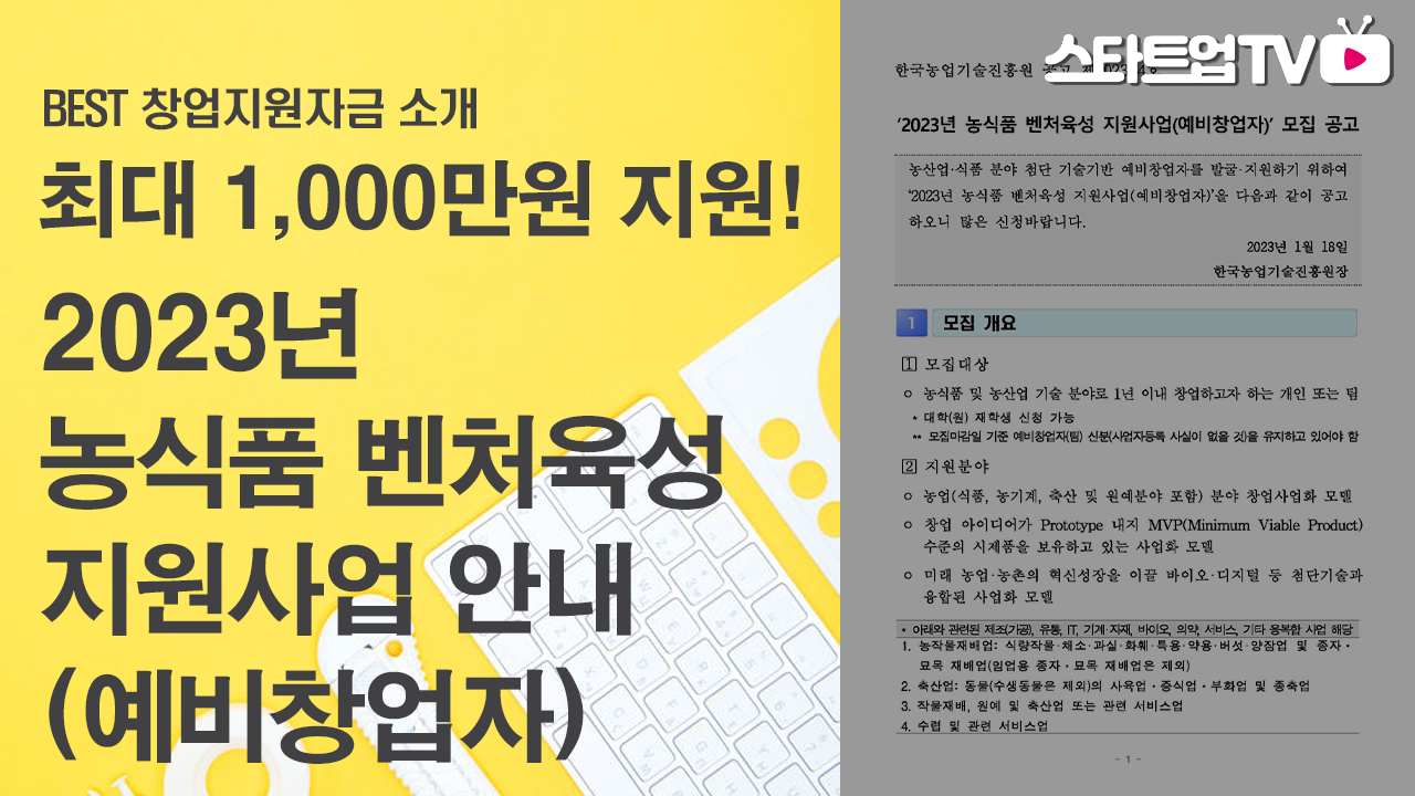 농산업, 식품분야 예비창업자에게 1천만원을 지원하는 농식품 벤처창업 육성사업 안내 #농산업#식품#예비창업자 본문