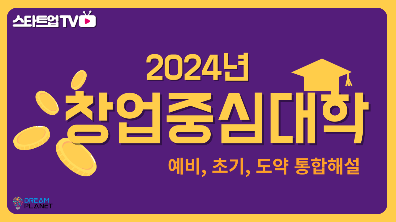 이번 영상은 예비창업자부터 창업 3년미만 초기창업기업, 그리고 창업 4~7년미만 도약창업기업에게 평균 5천만원 ~ 1억 2천만 원, 최대 3억원까지 사업화자금을 지원하는 2024년 창업중심대학 지원사업을 안내드립니다.