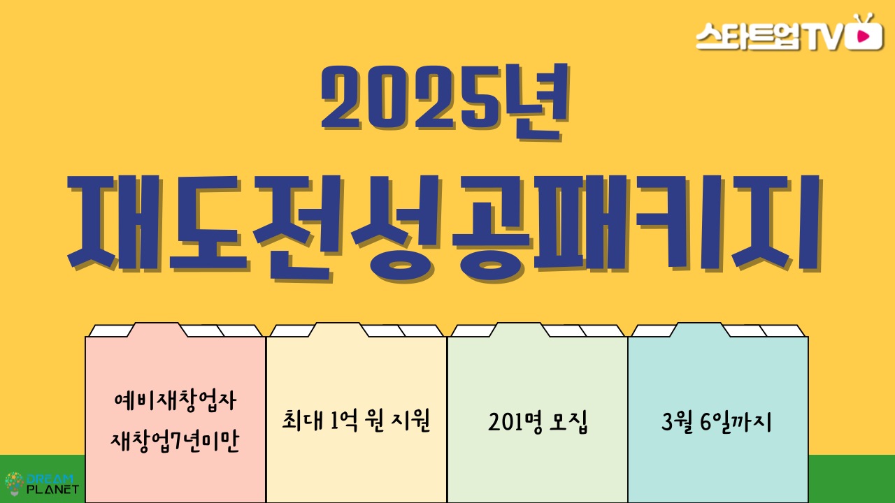 오늘은 예비 재창업자, 재창업 7년 미만 기업에게 최대 1억 원을 지원하는 2025년 재도전성공패키지 지원사업을 안내드립니다.